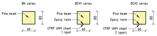 The bending test series, as illustrated in Figure 2, was composed of the following: BN—reference beams; BCH1—beams reinforced with a single layer of CFRP UHM sheet glued to the underside; and BCH2—beams reinforced with two layers of CFRP UHM sheet bonded one over the other to the underside. Each series (BN, BCH1, and BCH2) was composed of 5 beams. A total of 15 beams were tested (5 unreinforced and 10 reinforced). The degree of cross-sectional reinforcement was found to be 0.24 and 0.48% for the reinforced series BCH1 and BCH2, respectively. The reinforcement was confined exclusively to the tension zone.