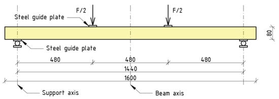 This study employed the use of pine beams. This species is a popular and widely utilised material in Poland, for example, in the fabrication of components for roof trusses. The dimensions of the beams were 80 × 80 mm in cross-section and 1600 mm in length. These dimensions were determined by the characteristics of the test site (maximum length of the beam), economic considerations, and the standard [12] (height of the beam proportional to its length) used.