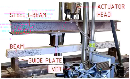 The view of the research station is shown in Figure 4. The bending tests were conducted on an MTS-322 testing machine (Shenzhen, China), which has an actuator capacity of 100 kN. The force generated by the actuator was divided into its constituent components by means of a steel crosshead. The load on the beams was regulated by establishing a constant displacement value for the actuator of the testing apparatus: 7 mm/min. The displacement speed was selected in accordance with the recommendations set forth in EN 408 [12], with the objective of ensuring that the failure of the unreinforced beams would occur within the recommended time frame. Steel guide plates, with a thickness of 1 cm and a width of 4 cm, were positioned on the supports and at the point of application of the concentrated force.