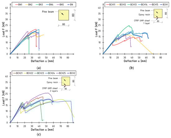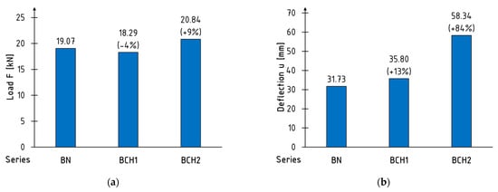 The mean values of the maximum force and the corresponding deflection are illustrated in Figure 6. The reinforcement did not result in a discernible impact on the augmentation of flexural load capacity. The mean value of the maximum failure force is comparable across all series. A modest increase was observed for the BCH2 series, amounting to 9%. Nevertheless, the beams of the BCH1 series exhibited a 4% decline in comparison to the BN series. This behaviour is attributable to the low elongation value at the point of composite failure. The composite failed to reach its strength before the object in question was damaged. It can be concluded that there are no notable discrepancies in the value of this parameter between the series. The load-bearing capacity of the section is that of the unreinforced wood, which is to be expected given the nature of the material. Nevertheless, it is evident that the BCH2 series beams exhibit a considerable increase in deflection when compared to unreinforced beams. This phenomenon is associated with the enhanced ductility of the beams following composite failure: the plasticisation of the section subsequent to sheet rupture. Despite the sheet rupture, it remained rigidly attached to the timber. This may indicate that, to a certain degree, the reinforcement had a restrictive impact on the tensile stresses in the shear zone.