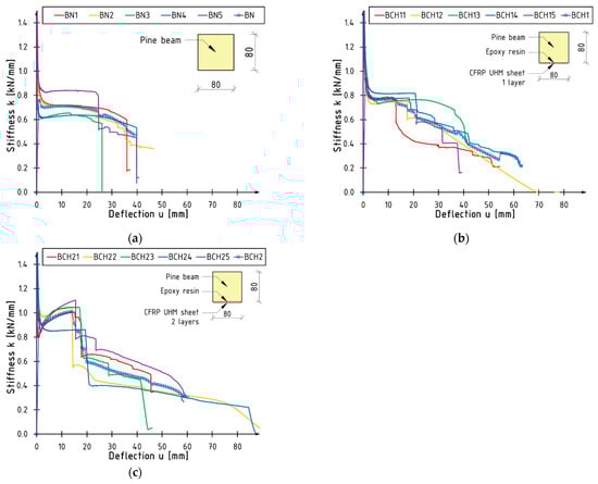 Stiffness versus deflection curves for series (a) BN; (b) BCH1; (c) BCH2.
