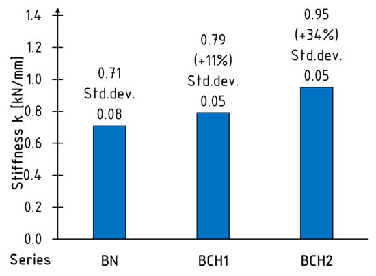 where F is the load value (in kilonewtons) and u is the deflection at the midspan (in millimetres). Given the considerable variability in stiffness during bending, the value was determined for a load range of 0.1 to 0.4 of the maximum force in order to account for this variability. The mean values for each series, along with the standard deviations, are presented in Figure 8. The increase in stiffness is 11 and 34%, respectively, for one and two layers of sheet reinforcement. It can be seen, therefore, that the relationship is not linear.