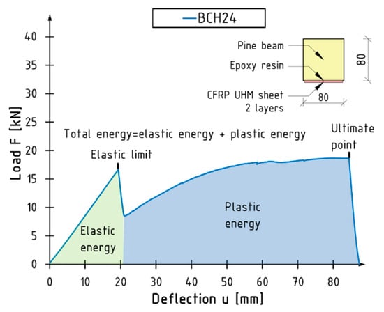 where Wel is the elastic energy (fraction of total) of the area under the load–deflection curve up to elastic limit and Wtot is the total energy of the area under the load–deflection curve up to failure. The elastic and total energies were estimated by integrating polynomials that describe the load–deflection relationship. The boundaries of the integration were defined by the characteristic points on the diagrams, including the starting point, the elastic limit, and the moment of failure of the beam. The following assumptions were made in order to facilitate the calculations: (1) the linear–elastic range occurred from the start of the test until the composite reinforcement broke (elastic limit) or a load equal to 0.7 Fmax was reached for unreinforced beams and (2) the plastic range was followed. In instances where substantial alterations were made to the course, polynomial gluing was employed in the relevant ranges. The calculations were performed using the software programmes MathCad 15 and Excel 2016. Figure 9 illustrates a section of a reinforced beam curve from a two-dimensional perspective.