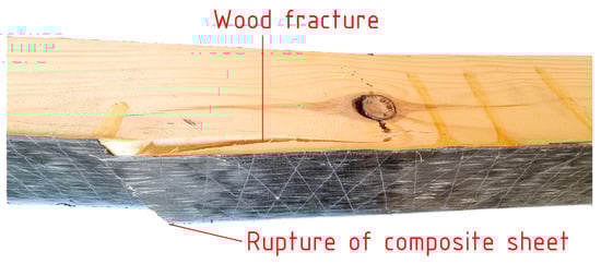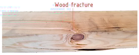 The failure of the non-strengthened beams was caused by the fracture of the timber in the tensile zone (failure mode marked earlier in the paper as T). The fracture was unanticipated and abrupt. The onset of failure occurred in the zone of maximum bending moment: tensile strength parallel to the grain was exceeded. As illustrated in Figure 10, the fracture originated within the knot. The cracking was accompanied by a loud sound.