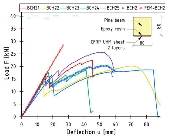 The outcome of the numerical tests is illustrated with the aid of the BCH2 series beams as a case in point. Figure 13 illustrates the curve derived from the numerical model (FEM-BCH2) in comparison to the other results. A highly satisfactory agreement was obtained within the linear–elastic range. Nevertheless, the model does not incorporate the fracture of the composite material or the alteration in the gradient of the curve. In the other series, the convergence of the results was comparable. The discrepancy between the experimental and numerical bending stiffness values was within a few percent.