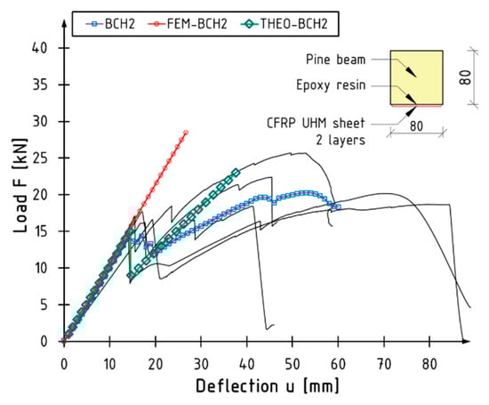 The authors propose that the curvature of the beam, which will be used to estimate the deformation of the external surfaces, should be employed to make a preliminary determination of the suitability of the material for reinforcement. It can be assumed that the deformation of the composite will be equal to that of the wood surface. The point at which the slope undergoes a change is when the limit strain in the composite is reached. The gradients of the individual curves are derived from the characteristics of the transformed or wood cross-section. It is evident that such a continuation will not align with the actual work. Through the implementation of suitable alterations, it is feasible to procure a more precise iteration of the graph in the subsequent phase. As a consequence of the aforementioned modifications, the second curve is shifted down to a point that corresponds to the theoretical position of the load–deflection relationship for an unreinforced beam, without the consideration of reinforcement. The aforementioned simplifications should facilitate an initial estimation of the suitability of the material type. Figure 14 illustrates the outcomes of this methodology for BCH2 series beams. The green colour with markers indicates the modified bilinear curve (THEO-BCH2). The model accurately predicts the failure moment of the composite and the load force fault. One limitation of this approach is that it does not consider the potential plasticisation of the wood and the associated risk of failure. Nevertheless, the predicted initial beam stiffness and the point of rupture of the composite corresponds well with the experiment.