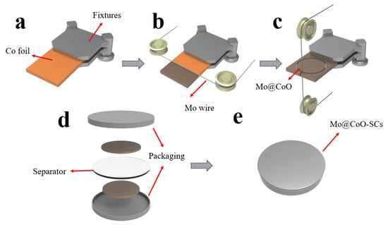 The process of fabricating binder-less Mo@CoO integrated electrodes and Mo@CoO-SCs using EDC technology. (a–c) Fabrication procedures for binder-free Mo@CoO integrated electrodes, and (d–e) assembly process for Mo@CoO-SCs.