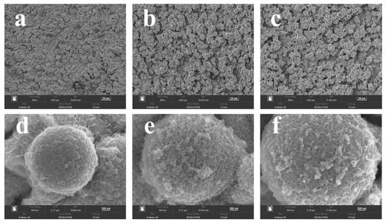SEM pictures for Mo@CoO integrated electrodes prepared using EDC with different pulse widths: (a) Mo@CoO-12, (b) Mo@CoO-24, and (c) Mo@CoO-36, and their high-resolution counterparts (d) Mo@CoO-12, (e) Mo@CoO-24, and (f) Mo@CoO-36.