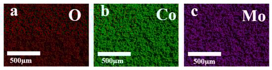 Figure 1 showed the fabricating procedures for binder-less Mo@CoO integrated electrodes using EDC technology and assembling procedures for Mo@CoO symmetric supercapacitors. A smooth cobalt foil was chosen as the workpiece, where the EDC technique employed a molybdenum electrode wire as the machining tool to generate electric sparks between the Mo wire and the cobalt foil. During the discharge process, a larger amount of heat was generated between Mo electrode wire and cobalt metal substrate, which can make the Mo wire and cobalt metal sheet melt. When the discharge processing is off, the molten materials can be quickly resolidified by the cooling effect of the deionized water, and subsequently the Mo doped CoO decorated with oxygen vacancy was formed directly on the Co metal substrate, which played the part of current collector. Subsequently, the Mo@CoO-SCs based symmetric devices were assembled. The SEM result (Figure S1) demonstrated that the surface of the Co metal substrate before EDC was smooth. The raw Co metal substrate is not a pseudocapacitive material. The ooxidation of Co metal substrate is critically important for the formation of pseudocapacitive materials with a mixed Co and Mo oxide layer. The EDC process results in changing of the surface morphology, which is shown in Figure 2. Figure 2a–c displays the SEM images of Mo@CoO-12, Mo@CoO-24, and Mo@CoO-36 electrodes fabricated using EDC with varying pulse widths of 12, 24, and 36 μs, respectively. Differences in microstructural features could be clearly observed, which reflects that the applied pulse width using the EDC technique had an important effect on the surface morphology of the Mo@CoO integrated electrode. The increase in particle size with the rise in pulse duration from 12 to 36 μs could be attributed to the prolonged exposure to high-energy electric discharges during the EDC process. Longer pulse duration results in extended heating cycles, allowing more material to melt, coalesce, and subsequently re-solidify into larger particles. The Mo@CoO-12 sample prepared by a pulse width of 12 μs exhibited smaller particles with a sparse distribution on the substrate, while the Mo@CoO-36 sample showed significantly larger particles with noticeable aggregation, which could provide a limited surface area for energy storage. In contrast, the Mo@CoO-24 sample features moderately sized particles with uniform and porous cobalt oxide particles across the Co foil. Additionally, high-resolution SEM images have been provided in Figure 2d–f, offering additional information on the surface morphology of Mo@CoO electrodes prepared with different pulse widths. Compared to the other two samples of Mo@CoO-12 and Mo@CoO-36, the unique nanostructures of Mo@CoO-24 particles indicate a relatively higher specific surface area, providing abundant surface-active sites that enhance ion adsorption, promote effective electrolyte interaction, and support faster surface Faradaic redox reactions. Moreover, EDS mapping was carried out to examine the element distributed characteristic of the Mo@CoO electrode. The examination results indicated the even distribution characteristic of molybdenum, cobalt and oxygen on the surface of the cobalt foil, which confirmed that the cobalt foil has been effectively oxidized and the Mo element has been successfully introduced into the oxide layer generated on the cobalt foil surface during the machining process of EDC (Figure 3).