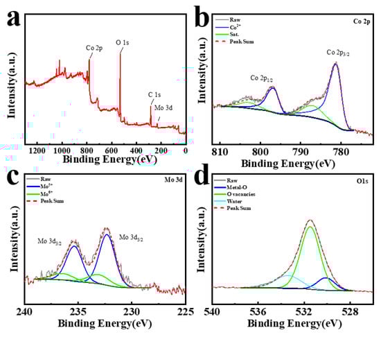 Thereafter, XPS detection was employed to analyze the surface content of Mo@CoO active materials. The XPS full survey spectrum presented in Figure 4a verifies that Co, Mo, O, and C are the main elements present in the Mo@CoO electrode. The deconvoluted Co 2p, Mo 3d and O 1s spectra are presented in Figure 4b, Figure 4c and Figure 4d, respectively. In Figure 4b, two prominent peaks located at positions 781.10 eV and 796.73 eV were accordingly indexed to Co 2p3/2 and Co 2p1/2 belonging to CoO, whereas the peaks positioned at 786.96 eV and 802.75 eV provided additional evidence for CoO formation [81,104]. In Figure 4c, the peaks appearing at 233.10 eV and 236.45 eV could be assigned to the Mo6+ 3d5/2 and Mo6+ 3d3/2 orbitals, whereas the peaks positioned at 232.30 eV and 235.35 eV were associated with the orbitals of Mo5+ 3d5/2 and Mo5+ 3d3/2, which confirmed the successful integration of Mo within the structure of CoO [81,105]. Furthermore, the peaks of 530.10 eV, 531.47 eV and 533.37 eV located at the O 1s spectrum of Mo@CoO could be deconvoluted to reveal the contributions of the Metal-O bond, oxygen vacancies, and surface-adsorbed water [106]. Therefore, the XPS analysis successfully revealed the introduction of molybdenum dopant into the structure of CoO and provides evidence for the presence of oxygen vacancies. Moreover, oxygen vacancies in Mo@CoO-24 were analyzed using room-temperature EPR (Figure S4). The EPR signal at g = 2.0060 closed to the free electron value of 2.0023, indicated that unpaired electrons had appeared, which furtherly confirmed the formation of oxygen vacancies in Mo@CoO-24 materials [65]. The simultaneous introduction of Mo doping and oxygen vacancies in CoO materials by EDC strategy was beneficial for the enhancement of the conductivity of the electrodes and energy storage [65,81].