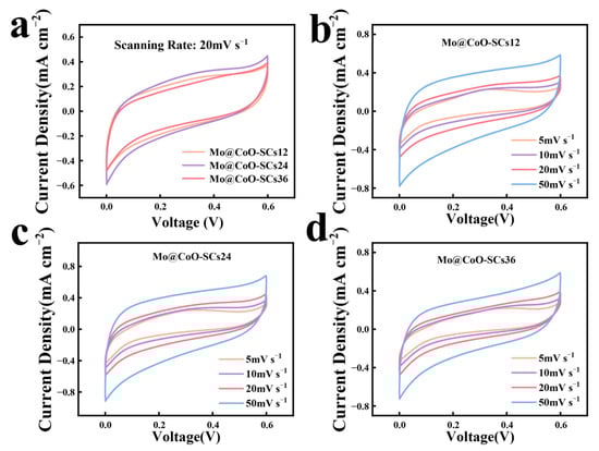 (a) CV profiles of Mo@CoO-SCs12, Mo@CoO-SCs24, and Mo@CoO-SCs36 at 20 mV s−1, CV profiles of (b) Mo@CoO-SCs12, (c) Mo@CoO-SCs24, and (d) Mo@CoO-SCs36 at various scan rates (5–50 mV s−1).