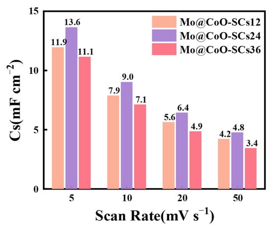 Corresponding areal capacitance of Mo@CoO-SCs12, Mo@CoO-SCs24, and Mo@CoO-SCs36 calculated from CV Profiles.