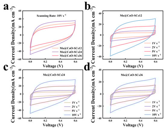 (a) CV profiles of Mo@CoO-SCs12, Mo@CoO-SCs24, and Mo@CoO-SCs36 at ultrahigh scan rate of 10 V s−1, CV curves for (b) Mo@CoO-SCs12, (c) Mo@CoO-SCs24, and (d) Mo@CoO-SCs36 at various ultrahigh scan rates (1–10 V s−1).