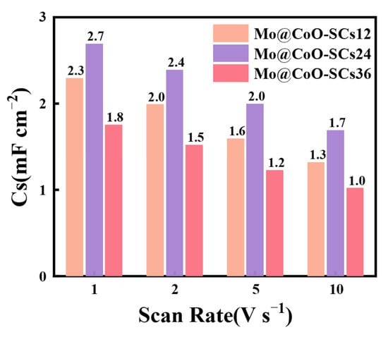Moreover, aiming to further demonstrate the merit of EDC for the preparation of Mo@CoO based coin-cell supercapacitors to meet the requirement of industrial applications, ultrahigh scan rates of 1, 2, 5 and 10 V s−1 were applied to check the capacitive performance of Mo@CoO-SCs12, Mo@CoO-SCs24 and Mo@CoO-SCs36 coin-cell devices. Figure 7b–d depict that all the CV profiles of Mo@CoO-SCs12, Mo@CoO-SCs24, and Mo@CoO-SCs36 at super-high scan rates of 1–10 V s−1 exhibited a quasi-rectangular shape, indicating that good capacitive behavior was achieved for these devices prepared by EDC. As the scan rate increases, the electrochemical reactions on the electrode surface accelerate, resulting in higher current responses, thereby increasing the CV curve area. Furthermore, the good capacitive performance of Mo@CoO-SCs demonstrated at high scan rates indicates their excellent dynamic response and suitability for high-rate energy storage applications. It is notable that the Mo@CoO-SCs demonstrated superior high-rate performance even at 10 V s−1, which is 200 times higher than typical scan rates applied for reported CoO electrodes [89,110,111]. The good capacitive performance achieved for all these devices is due to the Mo@CoO based binder-less integrated electrode design decorated with the doping of the molybdenum element and oxygen vacancy, which is greatly beneficial for the enhancement of their ionic/electronic conductivity. Moreover, it can be seen from Figure 7a that Mo@CoO-SCs24 device showed the largest CV curve area whereas Mo@CoO-SCs36 device obtained the smallest CV curve area, indicating that Mo@CoO-SCs24 obtained the largest current response and best capacitive performance and Mo@CoO-SCs36 gained the smallest current response and the worst capacitive performance among these three devices. This phenomenon was furtherly proved by their calculated areal capacitance presented at the bar graph of Figure 8. The results indicate that the areal capacitance decreases as the scan rate increases, as shown in the equation