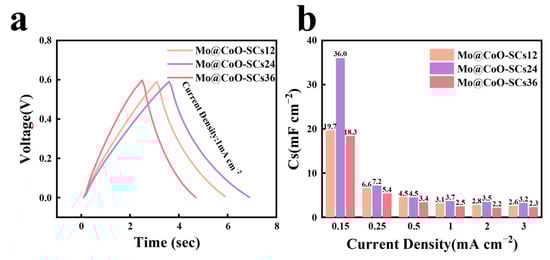 (a) GCD profiles of Mo@CoO-SCs12, Mo@CoO-SCs24, and Mo@CoO-SCs36 at 1 mA cm−2, (b) corresponding to areal capacitance of Mo@CoO-SCs12, Mo@CoO-SCs24, and Mo@CoO-SCs36 calculated from GCD Profiles at different current densities (0.15–3 mA cm−2).