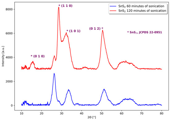 Tin sulfides were prepared via ultrasound-assisted synthesis many times. Nanoparticles of SnS were synthesized using direct sonication and reagents such as SnCl2, Na2S2O3 or Na2S, and CH3COONH4 in an unknown solvent [27,28,29]. Indirect sonication was also used in the sonochemical synthesis of SnS resulting in nanoparticles of 7 nm in the mean size, however, also in unknown solvent [30]. Using a mixture of ethanol and ionic liquid (1-buthyl-3methylimidazole tetrafluoroborane), and thioacetamide as a source of sulfur allowed for the synthesis of SnS with particles of sizes in the range from 50 to 700 nm [31]. On the other hand, starting from the same reagents but using ethylene glycol mixed with an amine (ethanolamine, diethanolamine or triethanolamine), it was possible to achieve SnS nanoparticles with sizes in the range of 4 to 15 nm [32]. There are fewer reports on the sonochemical synthesis of SnS2 in comparison with SnS. However, SnS2 nanoparticles of sizes in the range of 24–30 nm were prepared in aqueous solutions of SnCl4 and thioacetamide with the optional addition of concentrated hydrochloric acid [33,34,35]. Finally, quantum dots of both tin sulfides, with sizes varying from 1.5 to 10 nm for SnS2 and from 3 to 8 nm for SnS, were sonochemically obtained using the most technologically desirable solvent, which is water [36]. Despite the described approaches for the sonochemical synthesis of SnS and SnS2 (preferably in the form of quantum dots), the influence of the utilized solvent on the product is still unclear and more studies (using other solvents) need to be conducted.