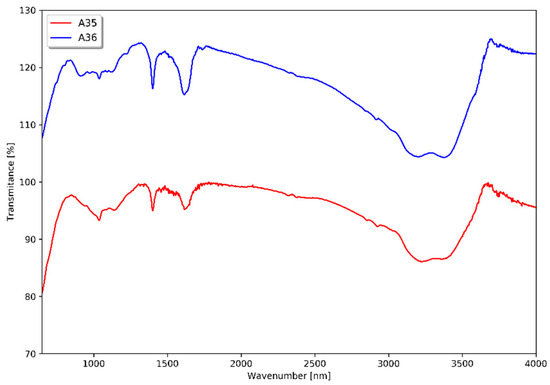 Typical Raman spectra of samples A35 and A36. A vertical dashed line was placed for 315 cm−1. Arrows indicate asymmetry of the A1g peak.