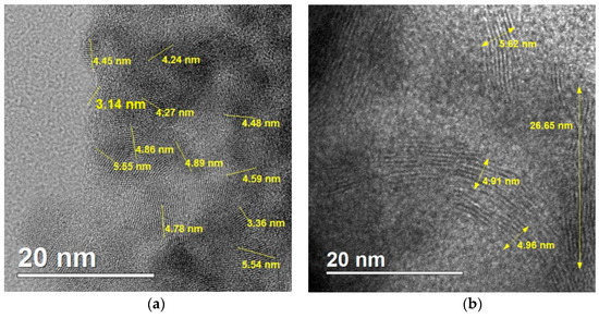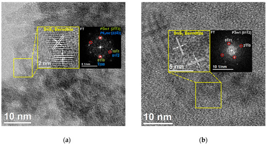 Observations made by the HR-TEM technique proved the presence of nanocrystallites in the prepared samples of SnS2 (Figure 5). In the product of synthesis lasting 60 min, nanocrystallites with sizes in the range from 3.5 to 7.5 nm were confirmed (Figure 5a). Elongated and narrow nanostructures were present in the sample obtained by 120-min-long sonication (Figure 5b).
