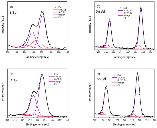 XPS spectra of S 2p (a,c) and Sn 3d (b,d) of sonochemically synthesized SnS2 quantum dots: (a,b) 60-min-long synthesis; (c,d) 120-min-long synthesis.