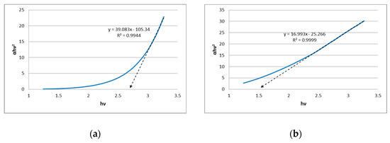 The Tauc plots of sonochemically synthesized SnS2 quantum dots: (a) 60-min-long synthesis; (b) 120-min-long synthesis.