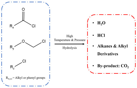 In conventional acid release systems, hydrochloric acid or similar simple inorganic acids are commonly used as the acid source. Due to the strong acidity of hydrochloric acid under all conditions and it being a volatile liquid that is difficult to store and transport, it performs poorly as a self-generating acid material in acid release systems, especially in encapsulated acid systems where hydrochloric acid solutions are difficult to encapsulate, increasing the difficulty of industrial production [11]. Therefore, it is necessary to choose suitable acid-generating agents to replace the commonly used hydrochloric acid solution. At present, the acid-generating agents used in acid release systems mainly include organic acid esters, a mixture of ammonium chloride and formaldehyde, halogenated hydrocarbons, acyl chlorides, etc. All of them have obvious drawbacks, such as high cost, insufficient acidity of the generated organic acids, being difficult to control acid generation, and large environmental pollution of the ammonium chloride and formaldehyde mixture [12,13]. In recent years, a variety of new slow-release acid generation systems have been developed to overcome the shortcomings of traditional acid generation agents. For example, asphalt, diesel, and ordinary acid were mixed to delay the reaction time of hydrogen ions through the oil phase [14]. Quaternary ammonium salt and other additives were used to increase the acid stability and acid etching temperature [15]. Urea derivatives were used as new slow-release materials instead of traditional acidifiers [16], etc. The above studies were able to partially improve the acidizing effect of the etchant in the formulation, but the delayed acid generation capacity and continuous acid generation ability were still unable to fully meet the growing industrial demand. At the same time, the emulsification system and unstable slow-release materials pose challenges to industrial production, storage, and transportation. To solve these problems, this study screened a kind of chloro-contained mixture as acid-generating material. This mixture was invented by the Sinopec Research Institute of Petroleum Engineering Co., Ltd. and was intended to be used for commercial purposes. The specific components are mixtures of chloroformate, combined with various alkyl or aryl acyl chlorides, chlorinated hydrocarbons, and chloromethyl ethers. Through relatively fine component adjustment, this acid-generating material with high chlorine content is relatively stable at room temperature and reacts slowly with water, as shown in the test results below. A protective layer, composed of polystyrene, polymethylmethacrylate, or other common polymers, was formed on the surface of the acid-generating material by encapsulation to further slow its acid release rate, thus preparing a series of new acid release systems. When the suspension formed by mixing this system with water is injected into the stratum, under the actions of high temperature and high pressure, the outer polymer layer will slowly hydrolyze and age, releasing the inner acid-generating material after a long time, and then hydrolyze to release hydrochloric acid, water, and hydrocarbon derivatives, as well as a byproduct of carbon dioxide, as shown in Figure 1. The hydrocarbon derivatives produced in the whole process are similar to those contained in the extracted oil, which will not damage the quality of the oil. Except for acid corrosion, carbon dioxide and hydrochloric acid will not have any impact on the environment at the same time. Therefore, this system is environmentally friendly when used and will not introduce new harmful residues to the ground.