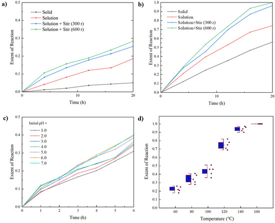 Hydrolysis degree of different forms of the chloroformate (a) at room temperature, (b) at 70 °C over time. (c) Hydrolysis degree at 70 °C with different initial pH levels over time. (d) Extent of reaction of the chloroformate after 6-h hydrolysis at different temperatures (each temperature measured five times).