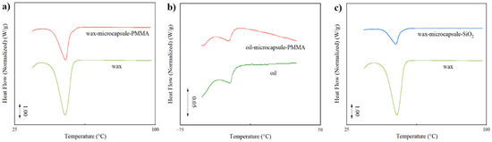 Differential scanning calorimetry (DSC) test results of microcapsules with (a) paraffin core material and pure paraffin, (b) bitumen core material and pure bitumen. (c) DSC test results of silica microcapsules with paraffin core material and pure paraffin.