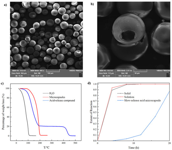 (a,b) The morphology of microcapsules prepared by the phase separation encapsulation method. (c) DTA scanning images of water, bulk chloroformate, and microcapsule samples prepared by the phase separation method. (d) Hydrolysis degree of different forms of chloroformate and encapsulated acid-release system at 70 °C over time.