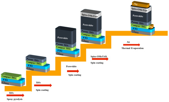 In this study, perovskite films were produced in accordance with the previously outlined methods as detailed in the referenced papers [55,56,57]. The articles delivered provided an in-depth examination of the reagents, detailing their concentrations and purity levels, alongside the sequence of procedures and equipment employed in the fabrication process of the Cs0.1(FA0.83MA0.17)0.9Pb(I0.83Br0.17)3 PSC [58]. The deposition process for triple cation perovskite films was performed on glass substrates with dimensions of 25 × 25 mm2, which were coated with a transparent layer of fluorine-doped tin oxide (FTO) (TEC 10, Ossila B.V., Sheffield, UK). Following this, around 7 × 25 mm2 of the FTO coating was eliminated from one edge of the glass substrate using zinc powder (Sigma-Aldrich, St. Louis, MO, USA) and hydrochloric acid (Merck KGaA, Darmstadt, Germany). A 20 min sonication was subsequently conducted in a 2% Hellmanex solution (Sigma-Aldrich, USA). The substrates underwent rinsing with deionized water followed by sonication in isopropanol (Merck KGaA, Darmstadt, Germany) for a duration of 20 min, preceding a plasma treatment lasting 10 min. Figure 1 presents a schematic illustration of the principal stages of fabricating perovskite solar cells. In the initial step, a compact layer of TiO2 (Greatcell-Solar-Italia S.R.L., Rome, Italy) with an approximate thickness of 30 nanometers was applied onto the FTO coating via spray pyrolysis of a precursor solution containing titanium diisopropoxide (bis) acetylacetonate Ti(acac)2OiPr2 (Merck-KGaA, Darmstadt, Germany) and anhydrous ethanol (Sigma-Aldrich, MO, USA) in a ratio of 1:9 by volume. The process was carried out at 450 °C and then subjected to 15 min of annealing. After the deposition process, the structures had enough time to reach room temperature. In step II, a mesoporous TiO2 layer was formed through the spin coating of 180 μL of a suspension containing titanium oxide nanoparticles (30 nm) diluted in ethanol at a 1:6 weight ratio. This was applied at 4000 rpm for 20 s, with an acceleration of 2000 rpm∙s−2. The substrates underwent annealing at 450 °C for a duration of 30 min. After the cooling process, the samples were transferred to a glove box that was filled with nitrogen (M-Braun Inertgas-Systeme GMBH, Garching bei München, Germany). In step III, the perovskite layer was deposited from a freshly prepared solution that included 1.2 M lead iodide (Sigma-Aldrich, MO, USA), 0.2 M methylammonium bromide (Greatcell Solar Italia S.R.L., Italy), 0.2 M lead bromide (Sigma-Aldrich, MO, USA), and 1 M formamidinium iodide (Greatcell-Solar Italia S.R.L., Italy). A solvent was formulated by combining anhydrous N,N-dimethylformamide (Sigma-Aldrich, MO, USA) with dimethylsulfoxide (DMF/DMSO) (Sigma-Aldrich, MO, USA) in a volume ratio of 4:1. The concentration of cesium ions in the precursor solution was modified to 10% through the addition of the suitable quantity of CsI (Strem-Chemicals INC MS, Newburyport, MA, USA) (1.5 M of CsI in DMSO). When producing the Cs0.1(FA0.83MA0.17)0.9Pb0.8Sn0.2(I0.83Br0.17)3 perovskite film, the solution of PbI2 and SnI2 in molar ratio 4:1 was added to the precursor. Until all components were fully dissolved, the precursor solutions were mixed at 60 °C for one hour, resulting in the formation of Cs0.1(FA0.83MA0.17)0.9Pb0.8Sn0.2(I0.83Br0.17)3 perovskite. A two-step program was implemented to spin-coat the prepared precursor solution: the initial stage involved a speed of 1000 rpm for 10 s, followed by a second stage at 6000 rpm for 30 s. The upper surface underwent treatment with 150 μL of chlorobenzene (Sigma Aldrich, MO, USA) for approximately 10 s prior to the cessation of spinning, followed by annealing at 100 °C for a duration of 60 min.