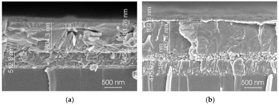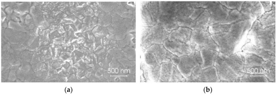 The top-view SEM images of two type perovskite films Cs0.1(FA0.83MA0.17)0.9Pb(I0.83Br0.17)3 and Cs0.1(FA0.83MA0.17)0.9Pb0.8Sn0.2(I0.83Br0.17)3 are shown in Figure 2. The perovskite films have comparable grain sizes and morphologies. Both films have smooth, pinhole-free surfaces, as has been noted before [60,61,62]. The grain sizes of the Pb-based perovskite films are smaller than those of the mixed metal Pb-Sn halide perovskite. As is known [62], the typical grain size is proportional to the perovskite layer thickness.