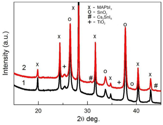 The XRD patterns of perovskite films fabricated using the solution without SnI2 (pattern 1, black) and with 20% of SnI2 and 80% of PbI2 (pattern 2, red) are presented in Figure 5. The patterns measured using the Bragg-Brentano method provide information not only from the perovskite film but also from the FTO (peaks labelled by “o”). Small peaks, visible on pattern 2 and labelled with the sign “#”, can be attributed to the Cs2SnI6 phase. A small peak at a 2theta angle of about 25.5 degrees should correspond to TiO2 (anatase) deposited on FTO before forming the perovskite.