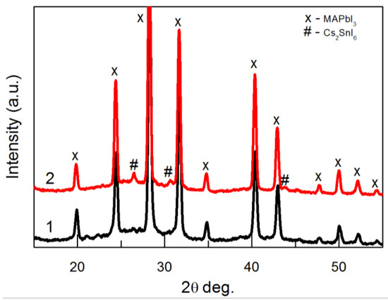 The XRD patterns of perovskite films on TiO2/FTO/glass substrate: pattern 1 (black)—without Sn; pattern 2 (red)—with the addition of 20% SnI2. Patterns were measured using the grazing incidence method.