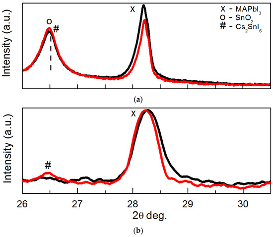 The fragments of XRD patterns in the 2θ range 26–30° are depicted in Figure 7. These contain XRD peak 004 of perovskite and peak of FTO (SnO2) or the Cs2SnI6 phase. Peaks of FTO and perovskite are seen in Figure 7a in the case of the Bragg-Brentano mode. It can be seen that in the case of perovskite formed with the addition of SnI2, the XRD peak 004 is slightly shifted towards the higher diffraction angles. That should be the result of the replacement of some part of Pb ions by those of smaller Sn in the perovskite lattice. The lattice parameter c decreases due to this replacement and causes the peak shift [63].