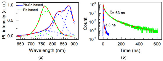 The PL spectra and transients measured at room temperature are shown in Figure 8. The peak of the Pb-based sample is fitted with two Gaussian functions. The difference is about 25 meV, close to the exciton binding energy determined from the absorption spectra [64]. The spectrum of the Pb-Sn based sample is fitted with three Gaussian peaks. One is fixed for the Sn-less sample, and two others are shifted to lower energies by 112 meV and 194 meV, respectively. The difference of 82 meV between them is too big to be related to the exciton binding energy. Thus, these two peaks could be related to the emission from differently sized crystallites or structures of different compositions [65,66].