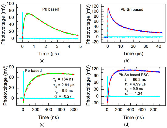The transient photovoltage decay observed in solar cells constructed from Pb-based materials (a,c) and Pb-Sn based (b,d) perovskite films. Excitation laser power density is 0.6 mW/cm2 for Pb-based PSC and 0.8 mW/cm2 for Pb-Sn based PSC; the laser pulse is shown in cyan.