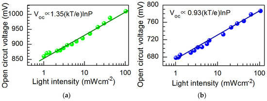 The gradient of the open circuit voltage across the PSC in relation to the logarithm of light intensity elucidates the bimolecular recombination mechanism (refer to Figure 10). As this slope in our samples is close to one, we modified Equation (5) using a hyperbolic decay [69] as