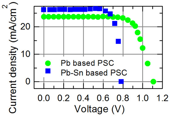 Current–voltage characteristics of the solar cells fabricated on Pb-based and Pb-Sn based perovskite films under 100 mW/cm2 of white light irradiance.