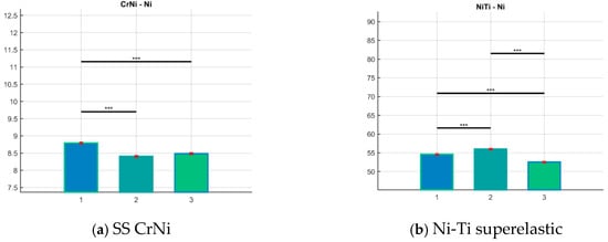 Mean bar plots with error bars for nickel content. The group numbers are placed on the x-axis: as received—#1; retrieved up to 6 weeks—#2; retrieved more than 8 weeks for archwires—#3. Wire composition is presented below each subgraph: (a) SS Cr Ni, (b) Ni-Ti superelastic, (c) HA Ni-Ti without copper, (d) HA Ni-Ti with copper, and (e,f) graded thermodynamic—TriTaniumTM and Bio-ActiveTM. The bars represent the mean of the compared nickel-containing archwires for each group (y-axis). The group mean is represented by a bar. Error bars are lines from the top of the bar parallel to the y-axis, representing the uncertainty or SD of the mean value. We marked it with asterisks which in terms of p-values are * p < 0.05; ** p < 0.01, *** p < 0.001.