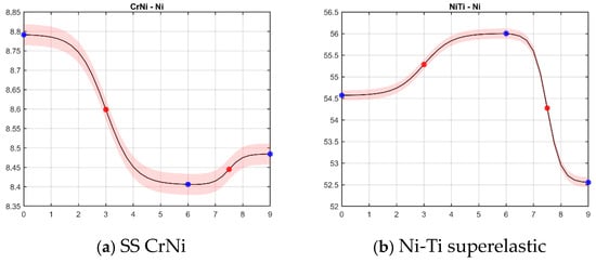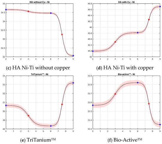 In Figure 4, the critical points are marked with red dots. According to Pontryagin’s maximum principle, these are the moments at which it should be decided whether to stop or continue the treatment with the archwires. The sigmoid (S-shaped) curves in each graph of Figure 4 represent how nickel content changes as an external variable is applied (intraoral aggressive factors such as bacteria, temperature, pH). These transitions could indicate phase changes or structural transformations in the wire materials, affecting how nickel is retained or released. Most graphs in Figure 4 have three plateau regions (at the beginning, around the 6th week, and at the end), with a steep increase or decrease between them. The plateau phases imply stability in nickel content, while the sharp transition suggests that nickel becomes more reactive or less stable under certain conditions.