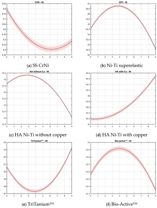 Cubic spline dynamics approximation of Ni content: (a) SS Cr Ni, (b) Ni-Ti superelastic, (c) HA Ni-Ti without copper, (d) HA Ni-Ti with copper, and (e,f) graded thermodynamic—TriTaniumTM and Bio-ActiveTM. The x-axis shows the weeks, and the y-axis shows the measured quantities after statistical analysis. The black curve shows the approximated NC dynamics. The error bars (statistical errors) are patched continuously around the black line. The curve shows the general tendency of Ni dynamics, approximated with smooth curves.