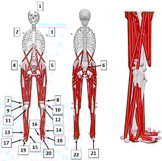 Applied marker set: 1—Head, 2—R. Acromium, 3—L. Acromium, 4—RASI, 5—LASI, 6—Sacrum, 7—RKNE, 8—LKNE, 9—RHFB, 10—LHFB, 11—RTUB, 12—LTUB, 13—RANK, 14—LANK, 15—RP1M, 16—LP1M, 17—RP5M, 18—LP5M, 19—RTOE, 20—LTOE, 21—RHEE, 22—LHEE.