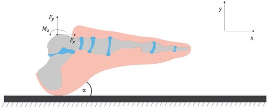 Initial conditions, encompassing the horizontal and vertical velocities of the ankle joint, the angle of the foot relative to the ground, and the angular velocity, were defined based on the recorded kinematic data at the moment of heel strike on the fixed ground. The loading was applied in the form of forces (comprising vertical and horizontal components) and the net muscle moment for the ankle joint throughout the entire stance phase. These loading conditions, calculated using the inverse dynamics method [51,52] and based on the measured segmental motions and ground reaction forces, were first validated through an analysis of the anatomical foot and then applied to the prosthetic gait model. The applied loading is illustrated in Figure 4.