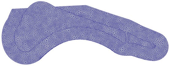 The optimization process considered three load cases according to the most essential phases of gait. The first involved heel strike on the ground, where the unit force was applied only at the lower edge of the design space, over a width of 24 mm. The second case involved a load limited to an area covering part of the toe. The third load case represented the middle support phase. The force was distributed over both previously described areas. In all three cases, the area of restraint remained the same—the upper surface, corresponding to the width of the talus in the sagittal plane (Figure 8).
