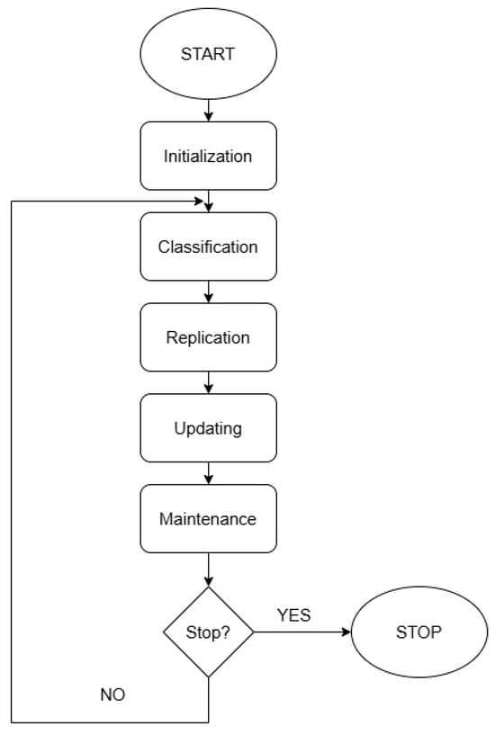 The first population of viruses is created in the initialization process (Figure 6). The following step is the random generation of the initial viruses. Viruses are classified as either strong (SVs) or common (CVs). During the replication procedure, a certain number of new viruses (NVs) are created from both strong and common members of the population. The newly generated viruses are calculated according to the following equations: