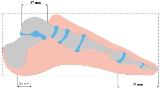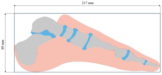 The analysis of various load cases provides insight into the influence of different forces acting on the prosthesis and their impact on the resulting material distribution within the design space. The proposed design space is defined as a rectangular domain, with its dimensions determined based on the anatomical dimensions of the foot (Figure 7).