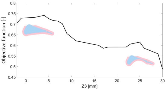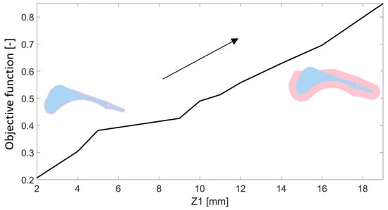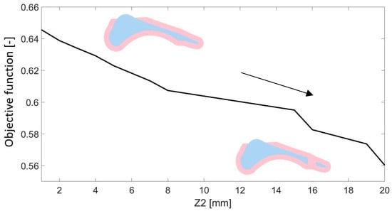 The first parameter, Z1, determines the offset of the outer edge of the sketch relative to the keel geometry. This offset defines the thickness of the shell surrounding the prosthesis core. This parameter was evaluated in the range of 2 to 19 mm. Figure 9 shows the correlation between the calculated value of the objective function and the thickness of the prosthesis shell. The smallest relative error observed between experimental data and simulation results corresponded to a parameter value of 2 mm. As the thickness of the shell increased, a proportional increase in the objective function was observed, with values ranging from 0.21 to 0.85.