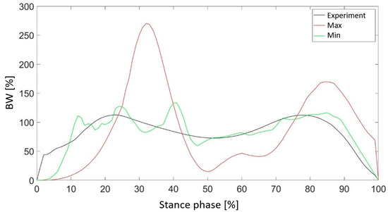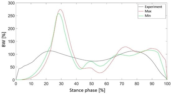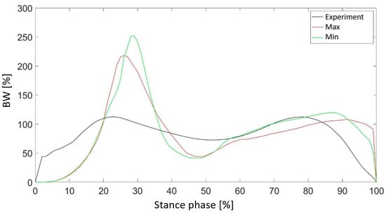 Figure 10 presents a comparison of the vertical component of the ground reaction force for cases characterized by the highest and lowest values of the objective function. Additionally, the results captured during experiments conducted with a physiological foot are included. Reducing the thickness of the outer shell allows for a more accurate representation of the vertical component of the ground reaction force, particularly in phases where local force maxima occur. Nevertheless, this case exhibited a higher frequency of local fluctuations in the force values. Conversely, for the maximum shell thickness, a shift in the occurrence of the force maximum was observed relative to the experimental results.