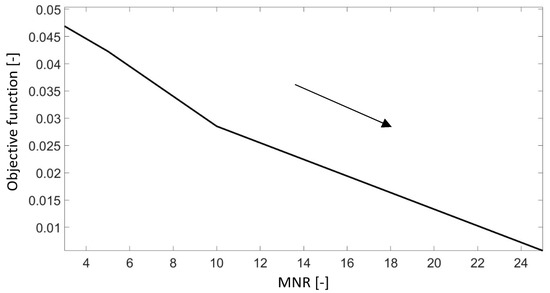 The algorithm has five parameters whose values have to be defined. These include the number of initial solutions (NIS), the number of strong viruses (NSV), the growth rate of new solutions from strong and common viruses (GRSV and GRCV), and the stopping criterion (maximum number of replications—MNR) [29,33,34]. For the VOA, the effect of individual algorithm parameters on the obtained value of the objective function was investigated. The ranges of the variables tested are shown in Table 3. The initial values were chosen based on preliminary testing, with NIS set to 1 and MNR to 3, providing reasonable initial results. The maximum values of NIS and MNR were set to 5 and 25, respectively, to ensure the best optimization performance while keeping computation time manageable.