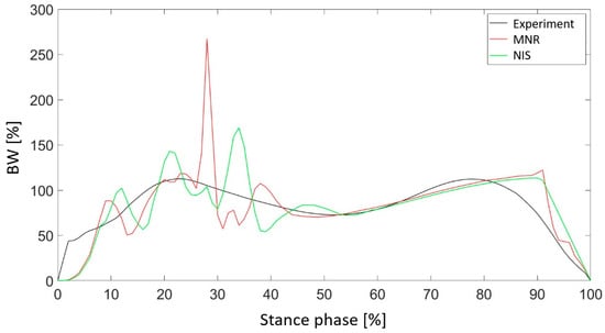 The oscillations observed in the simulated vertical ground reaction force are particularly noticeable during the initial stance phase—heel strike. Similar oscillatory patterns have been reported in another studies [57,58]. These oscillations are mainly due to the heel contact occurring at this stage of the gait cycle.