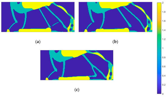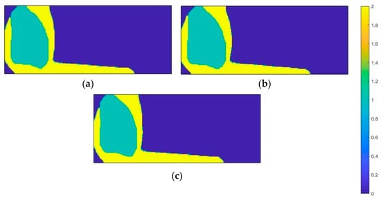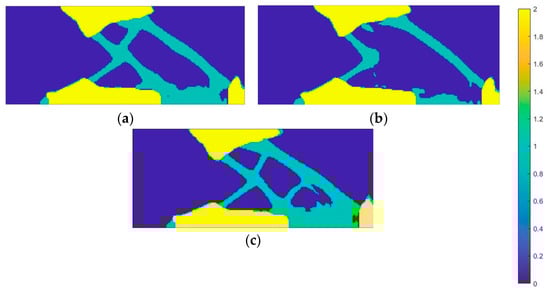 where E0 is the stiffness of the material, Emin is the stiffness with a small value assigned to void areas to prevent the occurrence of singularities in the stiffness matrix, and the variable p denotes the penalty factor [55]. The objective function is to minimize the compliance (c), defined as: